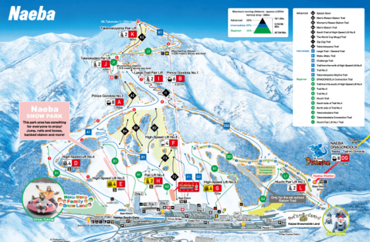 Naeba Ski resort is interlinked with the slopes of Kagura Ski Resort by Japan’s longest Gondola, Dragondola. The entire area is called Mt Naeba and consists of 4 ski areas, over 40 trails and Kagura boasts the longest run at 6kms. Both ski areas offer terrain perfect for all abilities.
